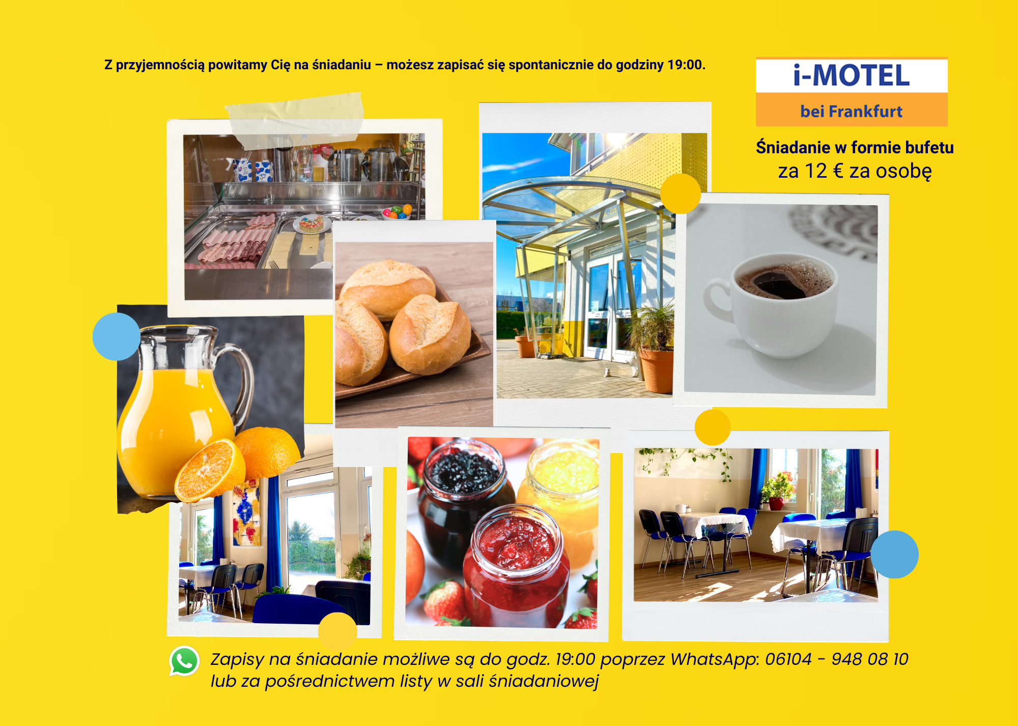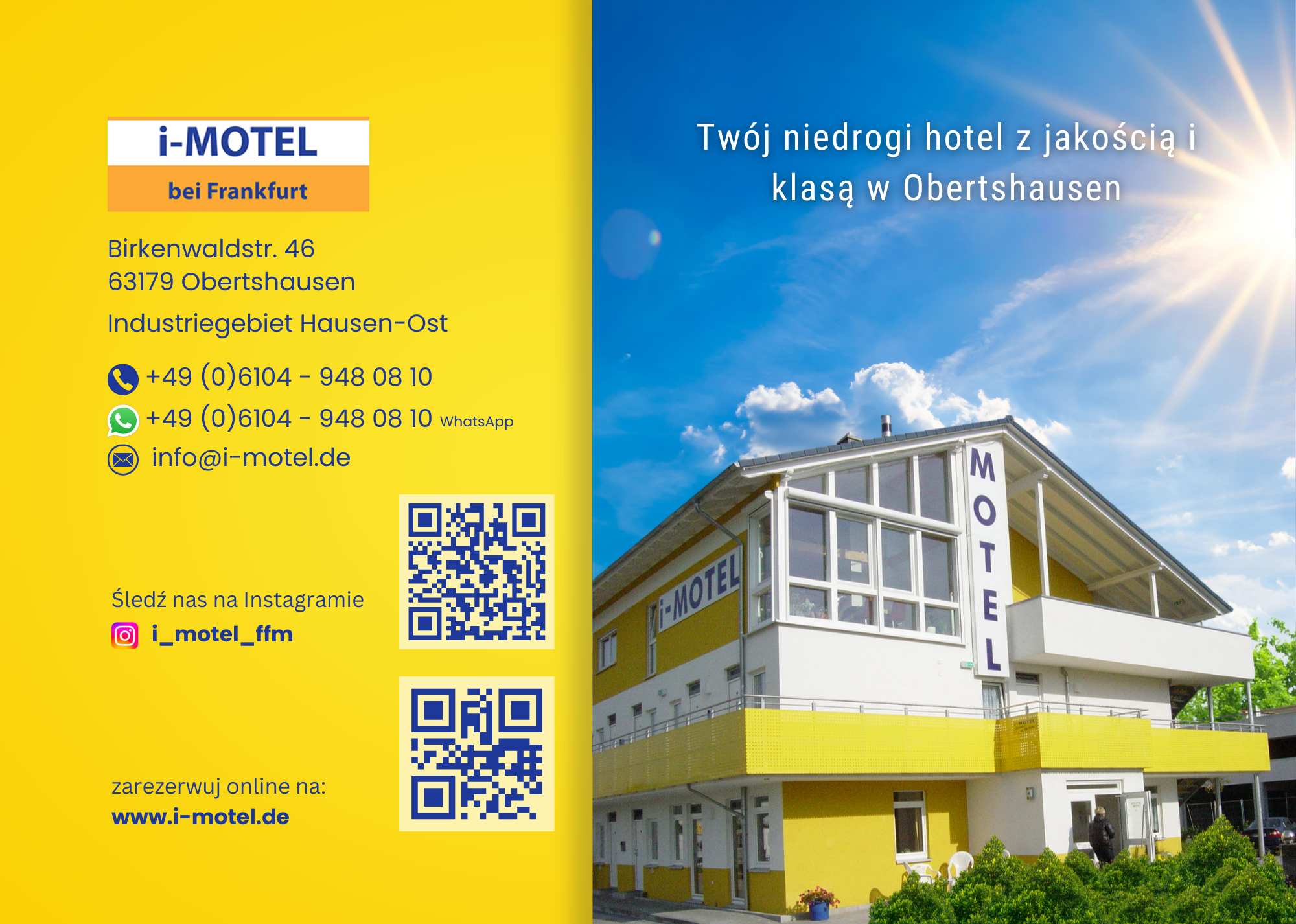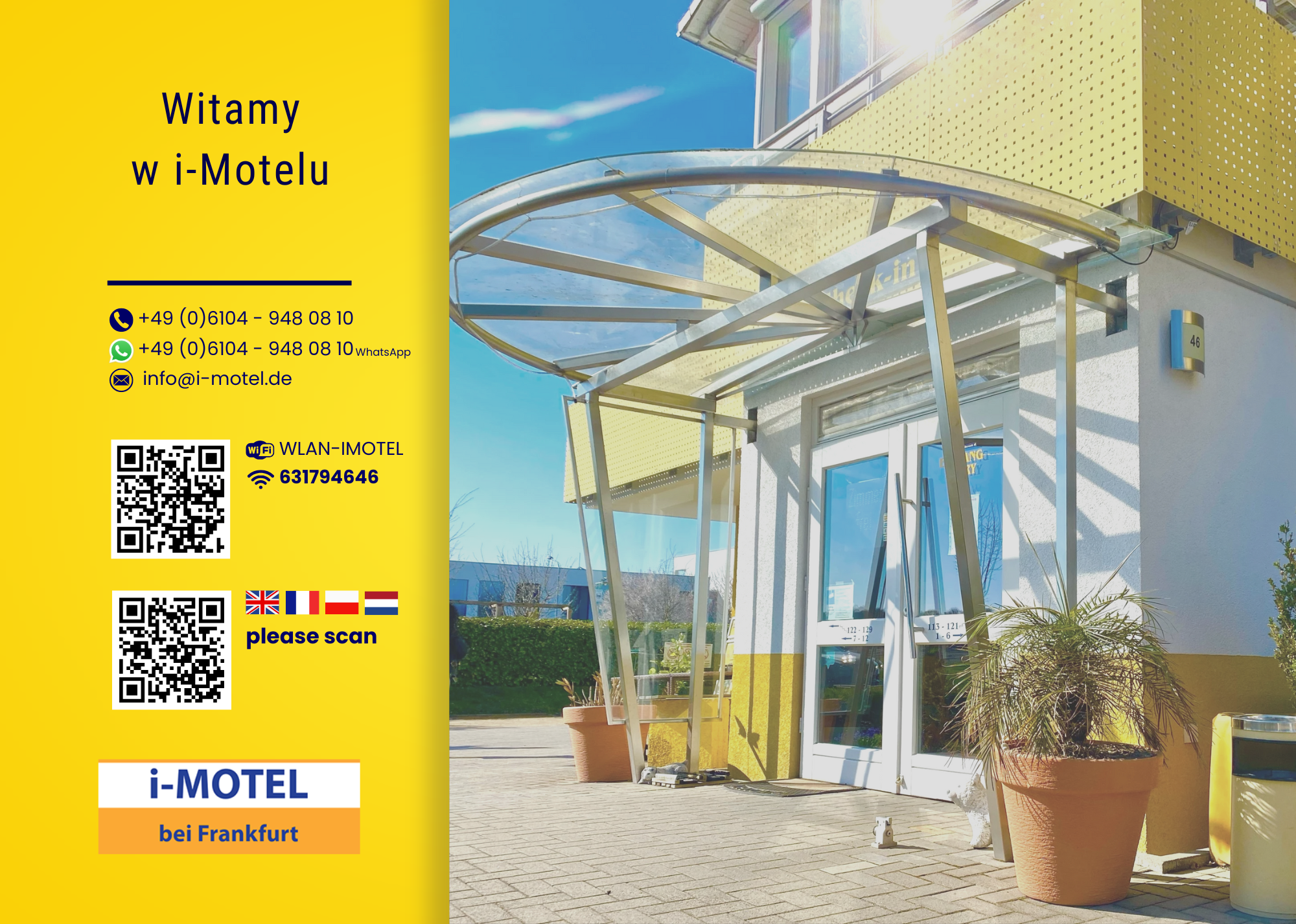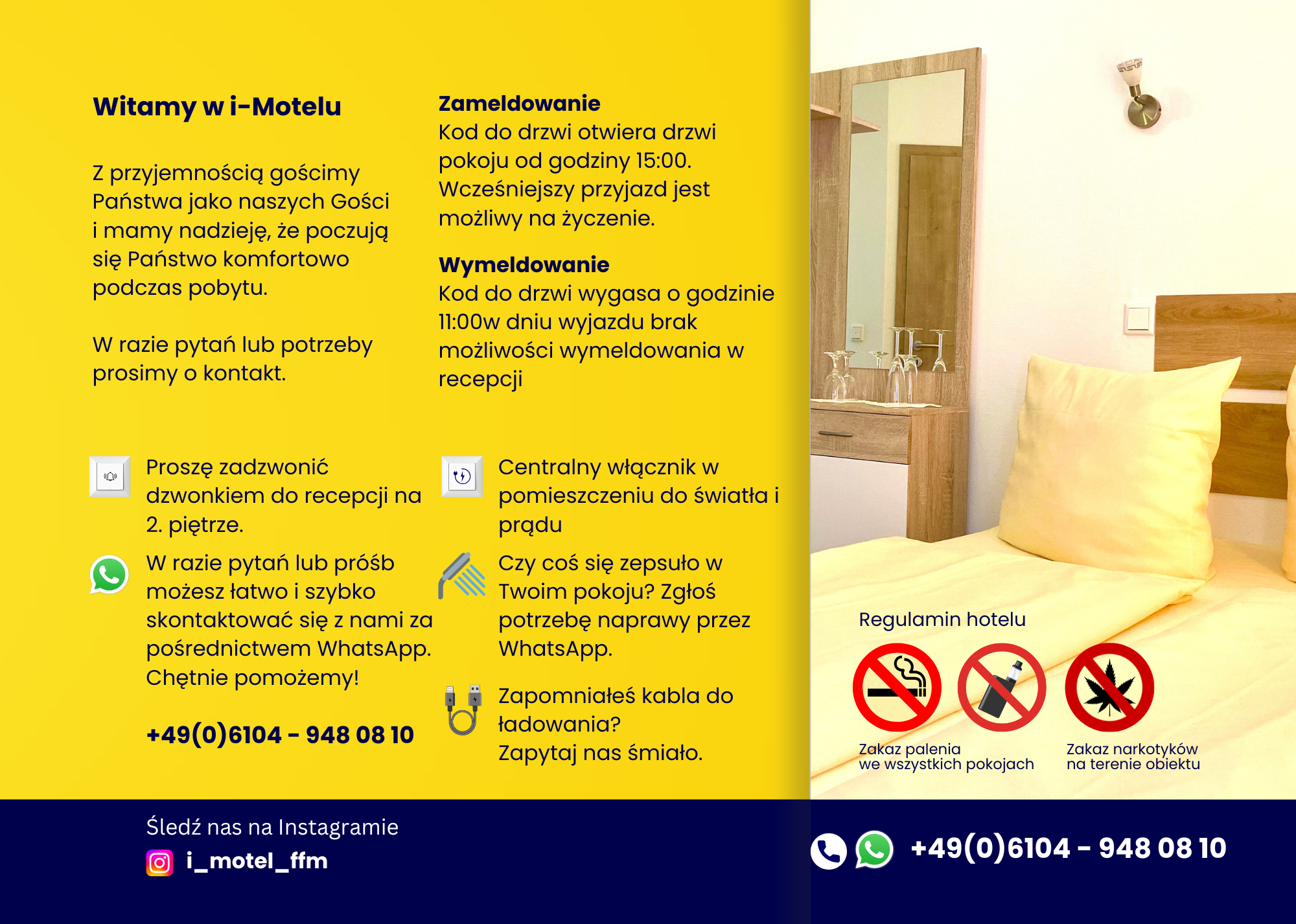 Tutaj znajdziesz informacje dla gości i-Motelu w Obertshausen. Ten przewodnik zawiera kluczowe informacje, takie jak godziny zameldowania i wymeldowania, dostęp do Wi-Fi, parking, udogodnienia na miejscu, wskazówki dotyczące bezpieczeństwa oraz sposób kontaktu z naszym zespołem w celu uzyskania pomocy podczas pobytu. Życzymy komfortowego i przyjemnego pobytu.